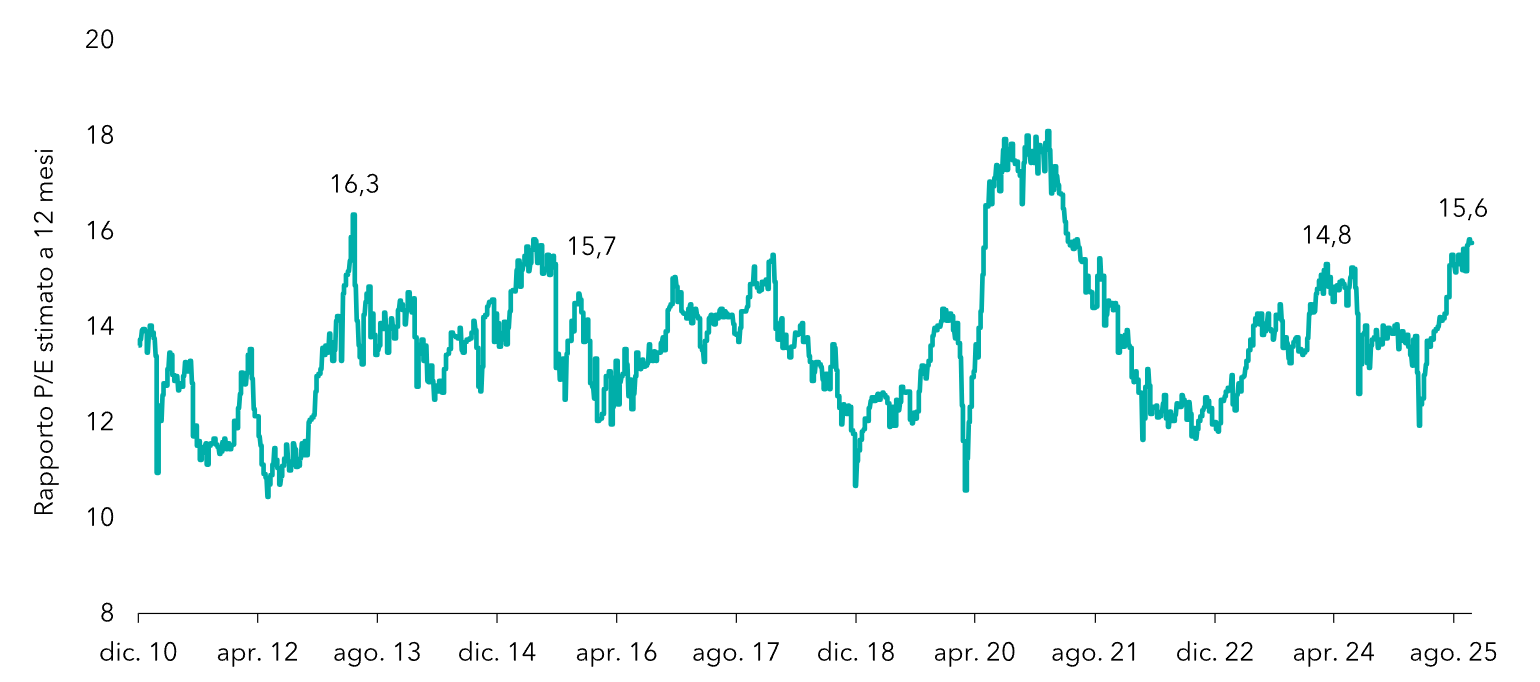 Multiplo P/E a 12 mesi del Topix al limite superiore dell'intervallo di 15 anni