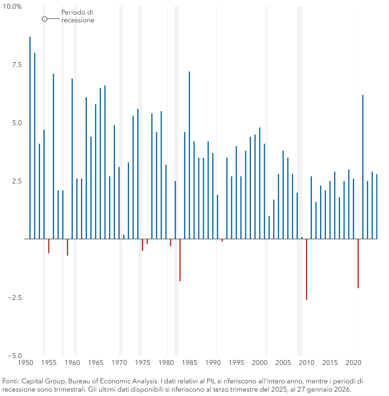 Un grafico a barre mostra la crescita annuale del PIL reale degli Stati Uniti dal 1950 al 2025, con la maggior parte degli anni che registrano una crescita compresa tra il 2% e il 7%. I periodi di recessione sono contrassegnati da barre ombreggiate, durante i quali la crescita del PIL ha spesso subito un calo, compresi diversi anni con crescita negativa. La crescita è diventata più moderata dopo il 2000, con brevi cali durante la crisi finanziaria del 2008-2009 e la pandemia del 2020.
