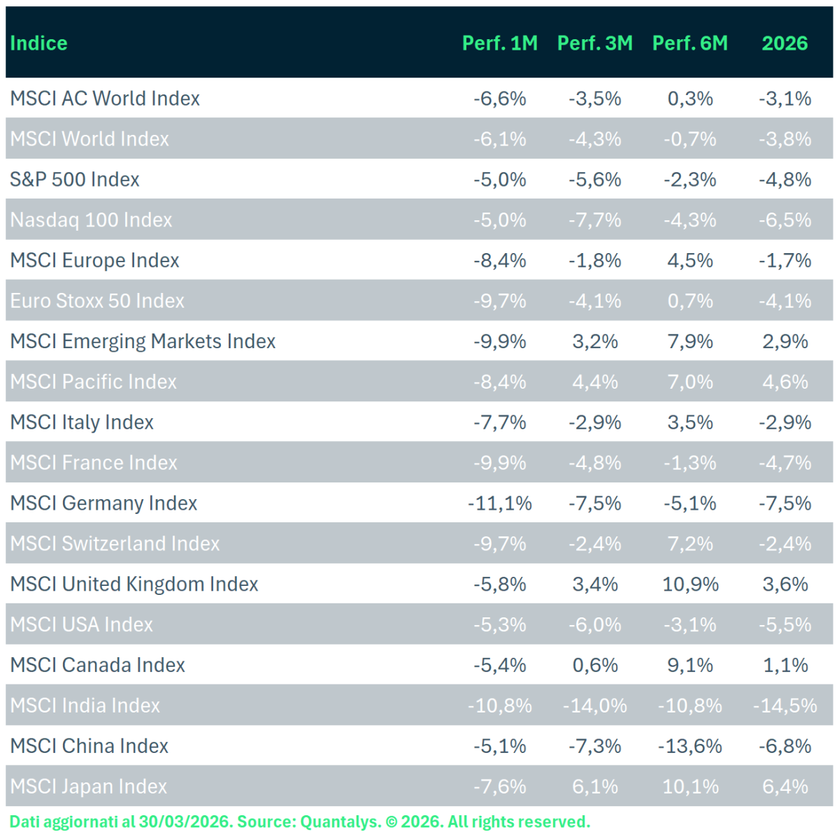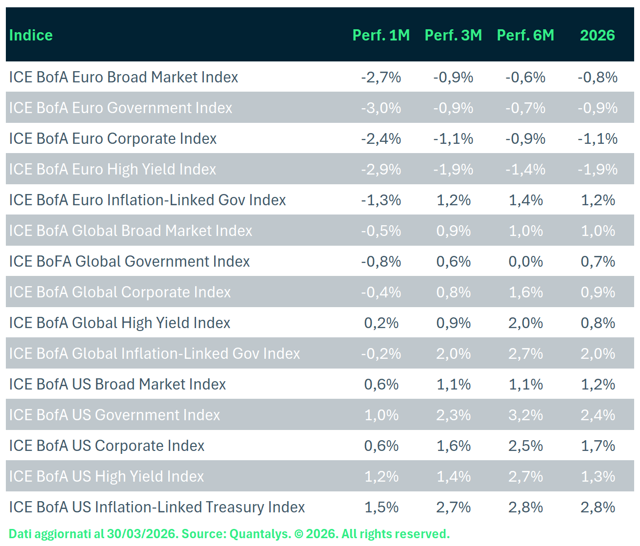 © 2026 Quantalys. Tutti i diritti riservati. Le informazioni fornite sono di proprietà di Quantalys Italia Harvest Group; possono non essere esaustive e non costituiscono raccomandazione o sollecitazione all’investimento. Quantalys Italia Harvest Group non si assume alcuna responsabilità per le eventuali conseguenze derivanti da decisioni assunte o iniziative intraprese sulla base delle informazioni riportate nel presente documento. Tutti i dati sono aggiornati alla data indicata e attribuiti a Quantalys Italia Harvest Group, salvo diversa indicazione.